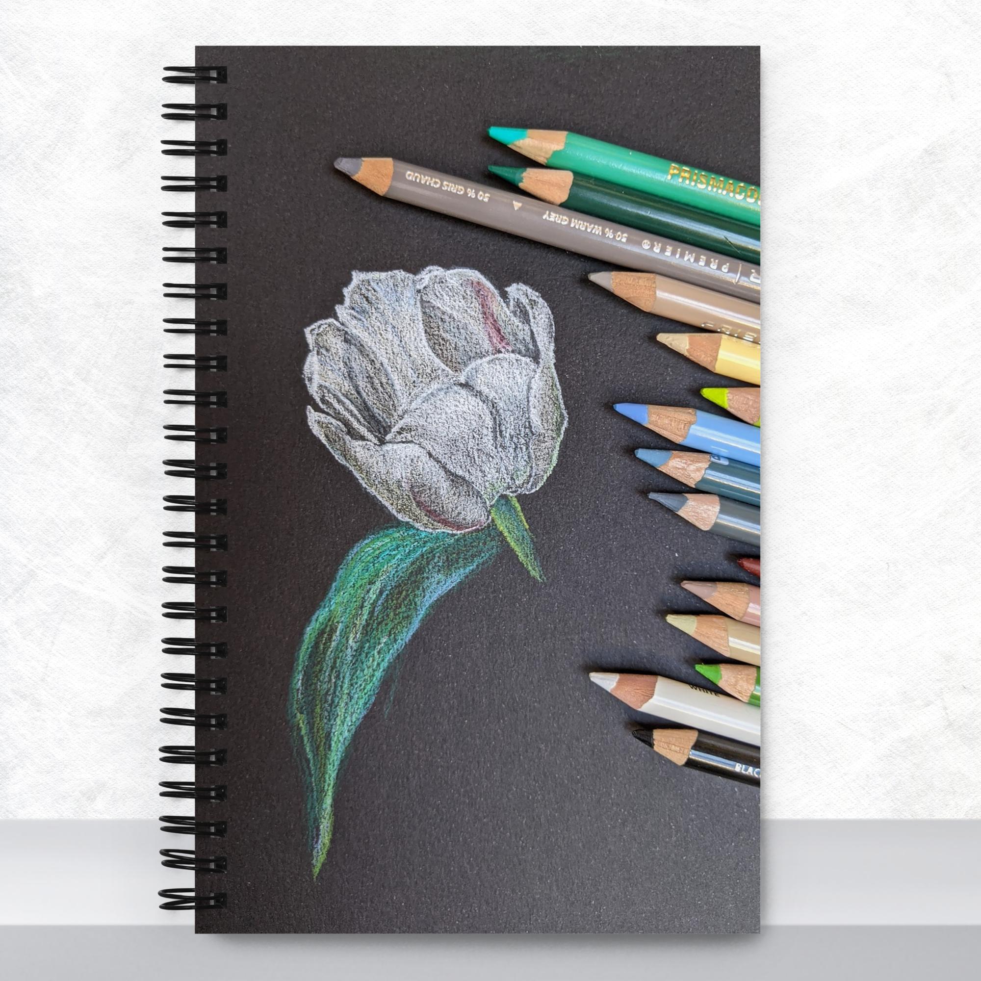 Bring a touch of studio magic to your everyday notes. This spiral notebook showcases a hand-drawn tulip rendered on deep black paper, giving the vibrant petals a luminous, almost glowing presence. Along the edge of the artwork sit the colored pencils used in its creation—an intentional nod to the artistic process and the beauty of traditional media.