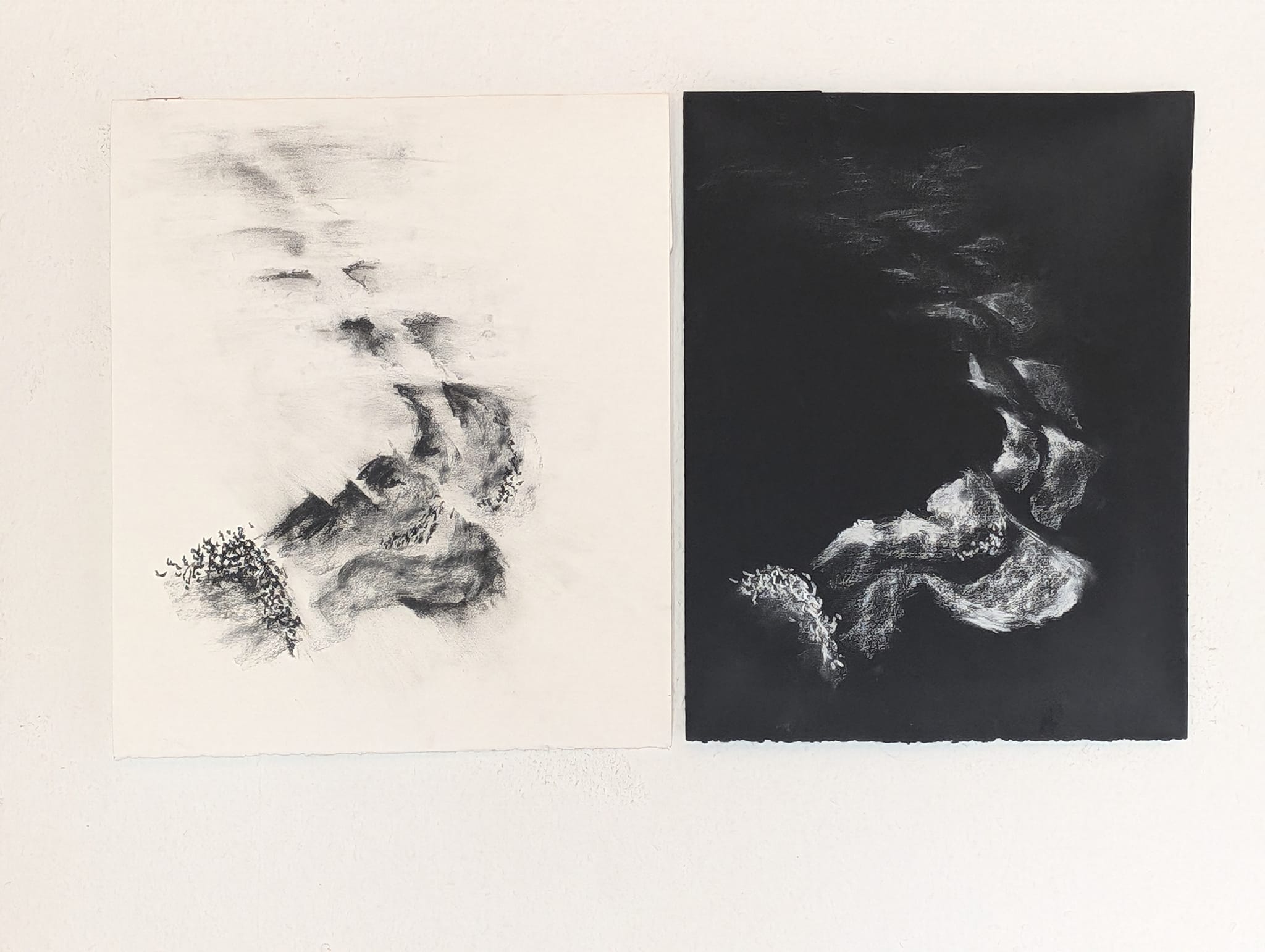 These process pieces are multi stage creations, going from a design, to a physical object, light cast upon that object, and the shadows of that object captured again.  Layered or solo they reflect the impermanent nature of light and emotion.